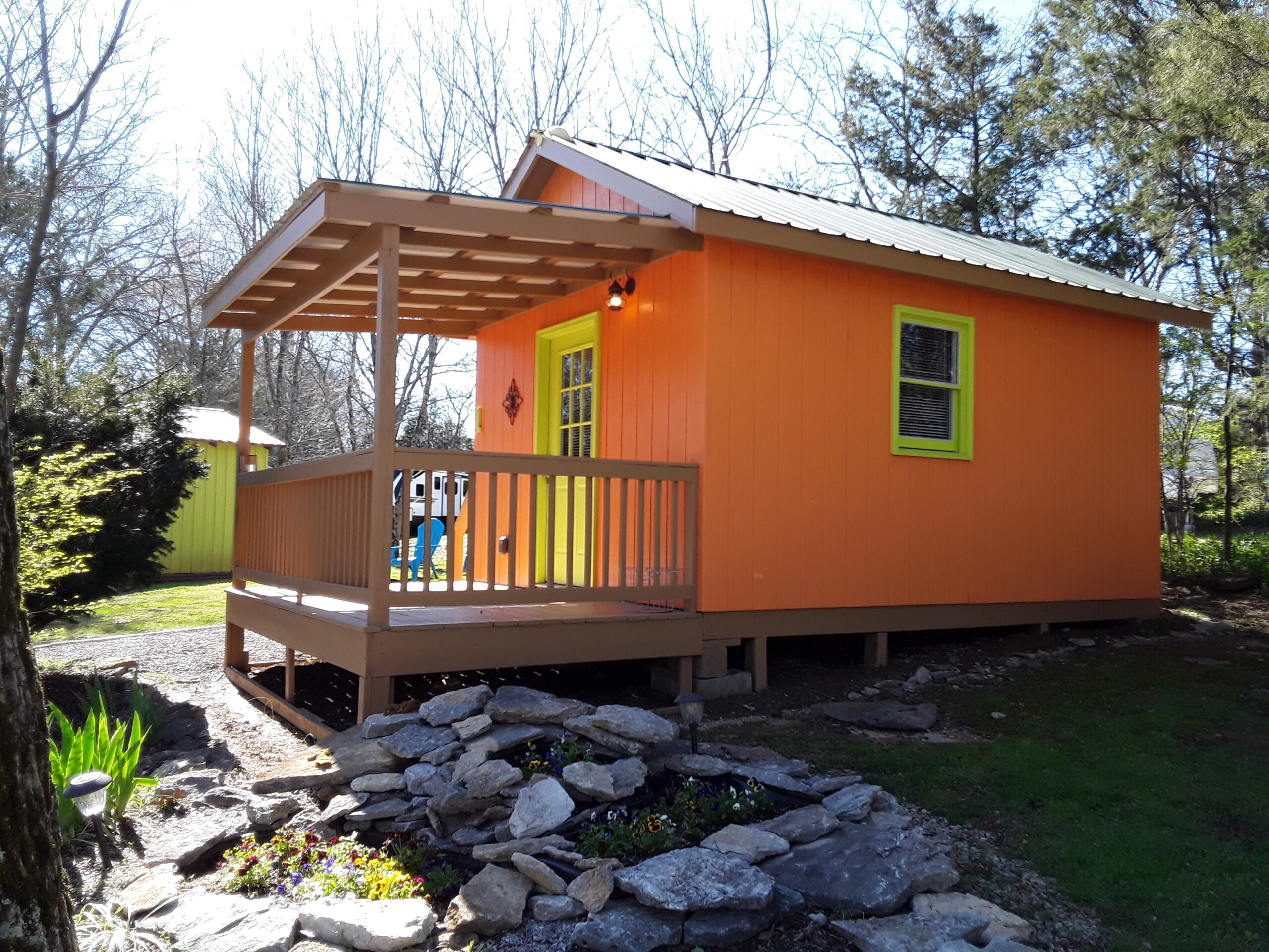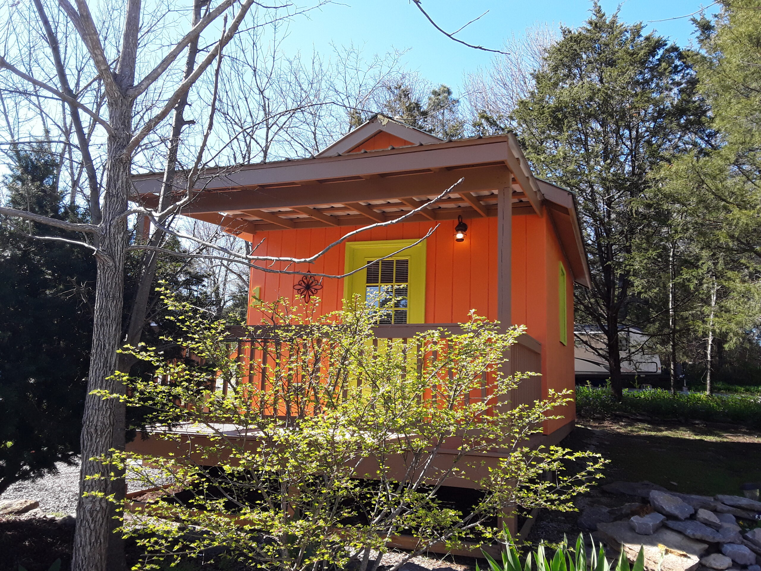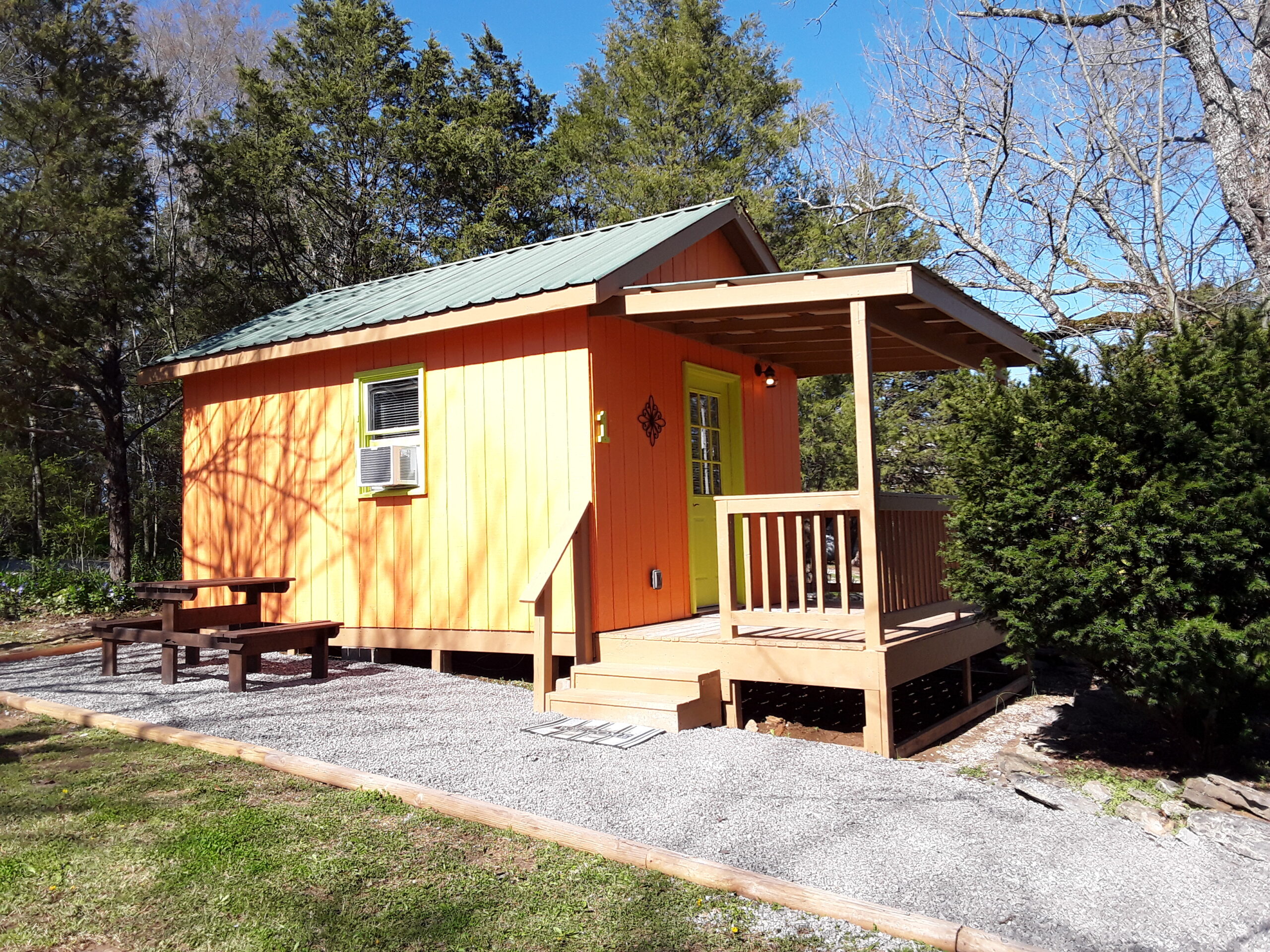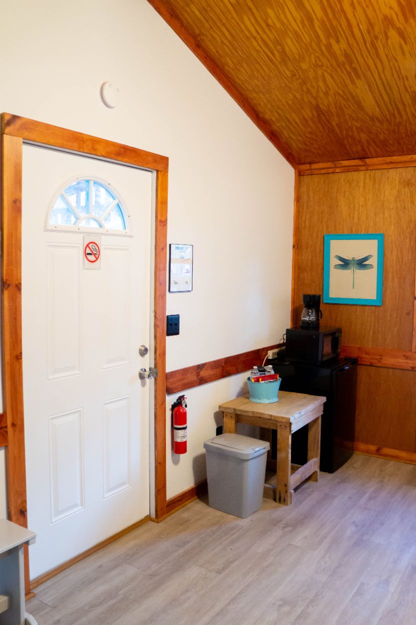 Outside, there is a fire pit with seating and a picnic table. A few bottles of water, coffee, cocoa, a bundle of firewood and a s’mores kit provided. There’s a water spigot right behind the cabin. To provide a quiet, restful experience for all our guests, Campers RV Park does not allow ATVs, UTVs, motorcycles or dirt bikes in the campground.