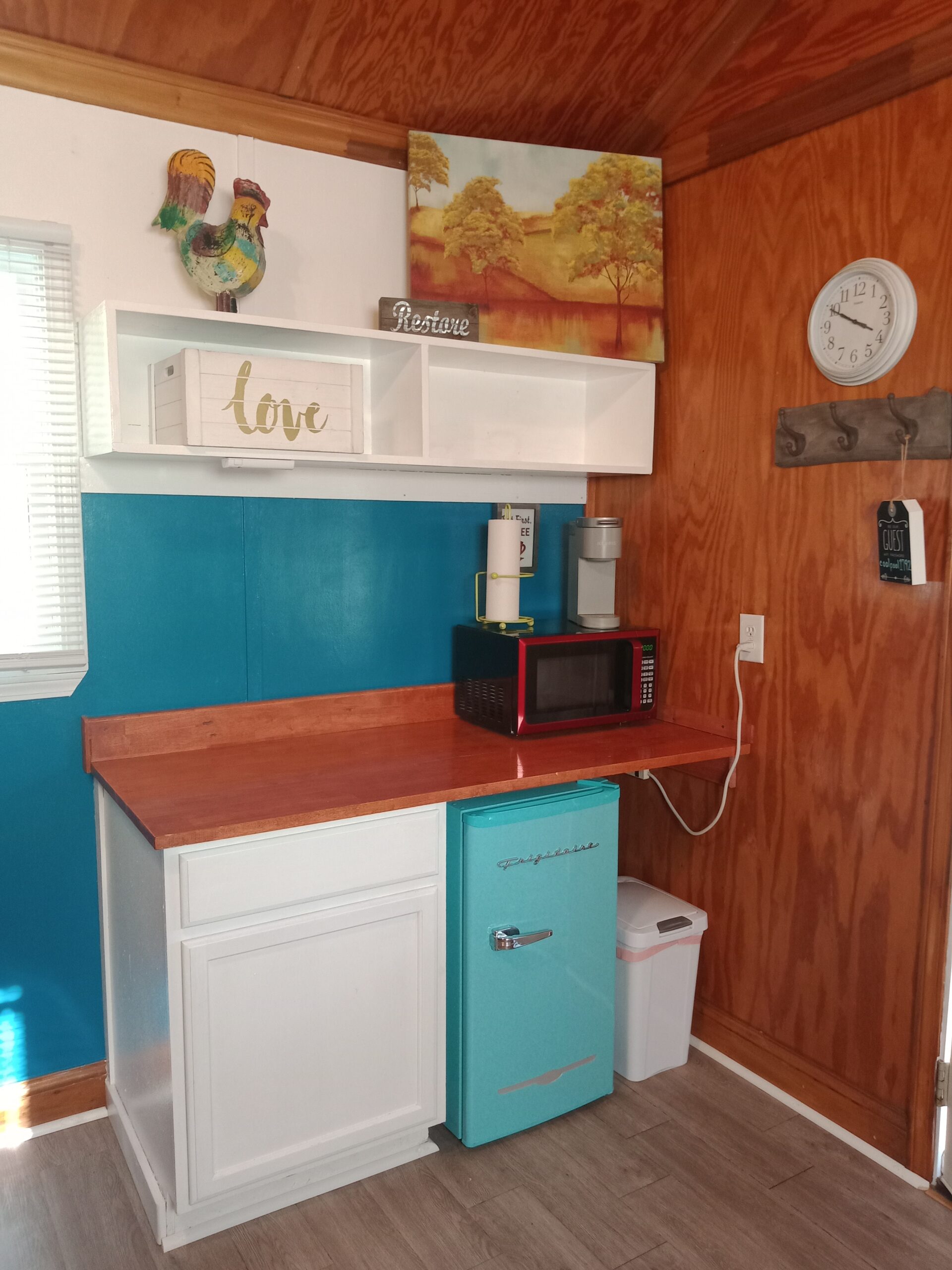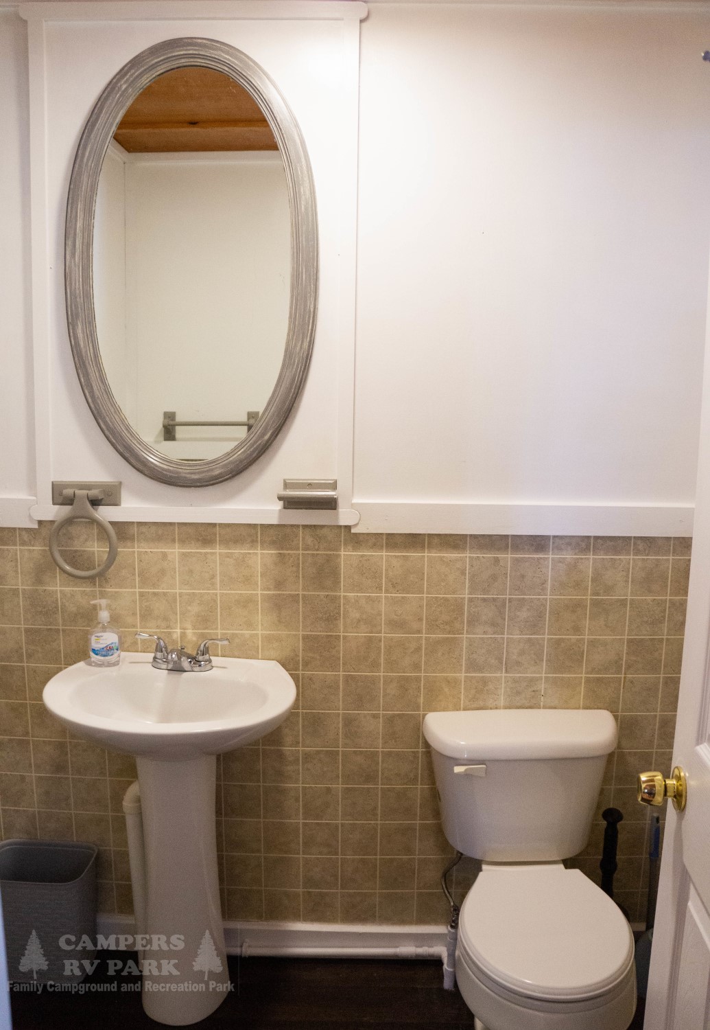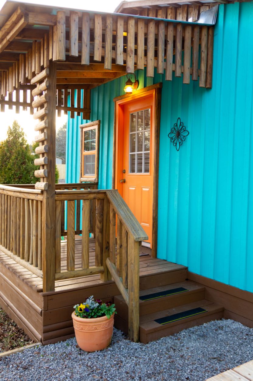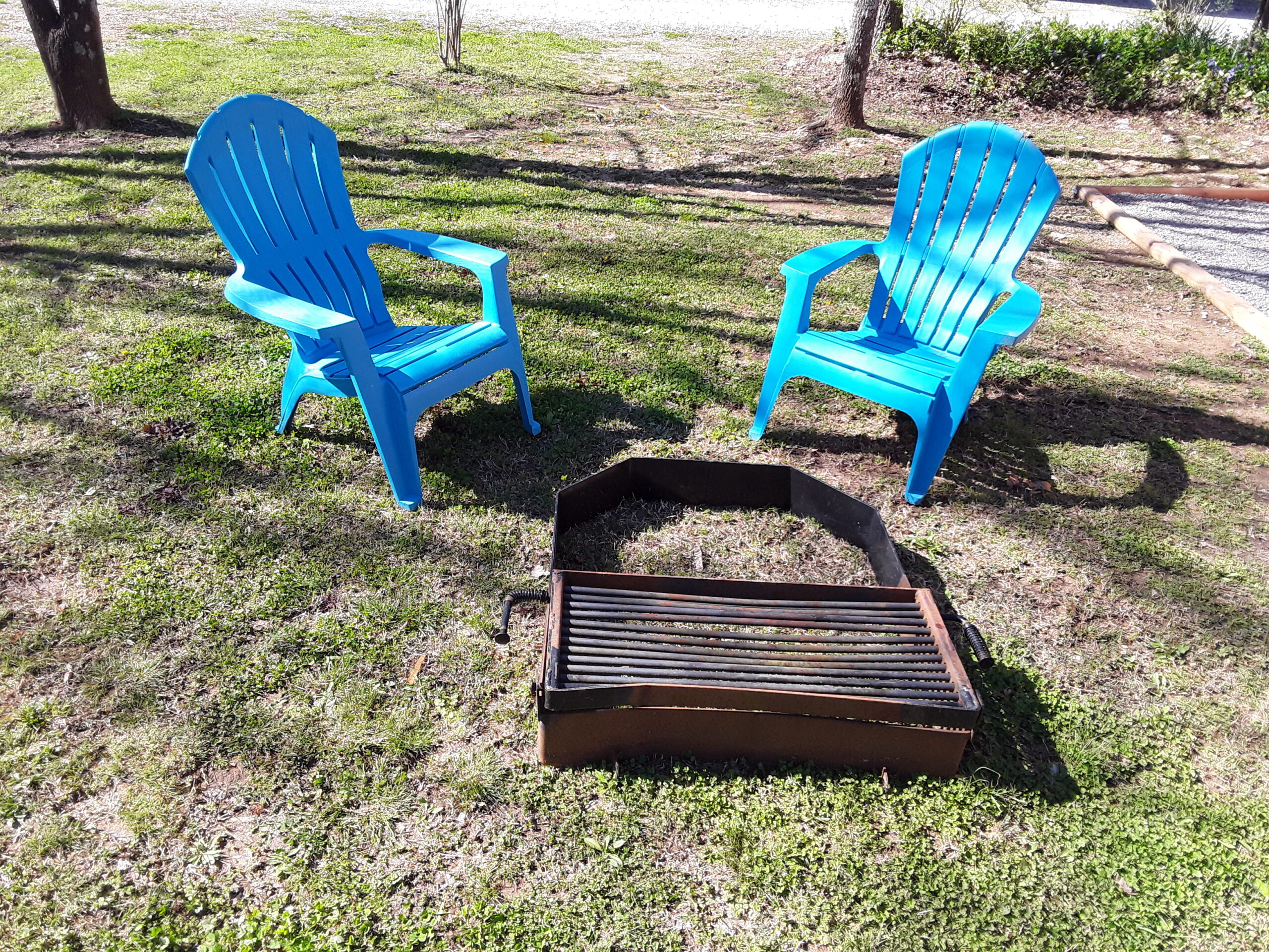 Outside, there is a fire pit with seating and a picnic table. A few bottles of water, coffee, cocoa, a bundle of firewood and a s’mores kit provided. There’s a water spigot right behind the cabin. To provide a quiet, restful experience for all our guests, Campers RV Park does not allow ATVs, UTVs, motorcycles or dirt bikes in the campground.