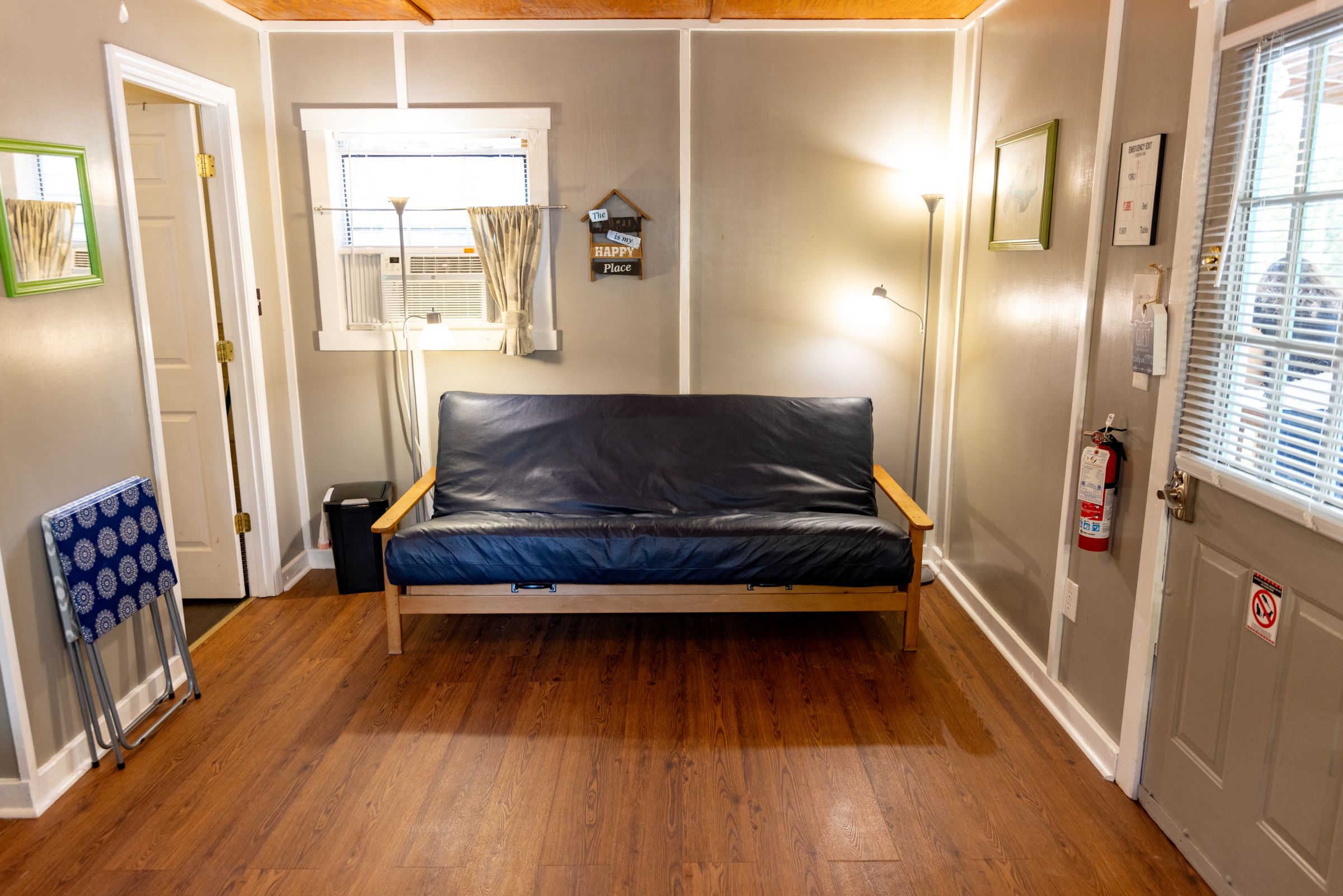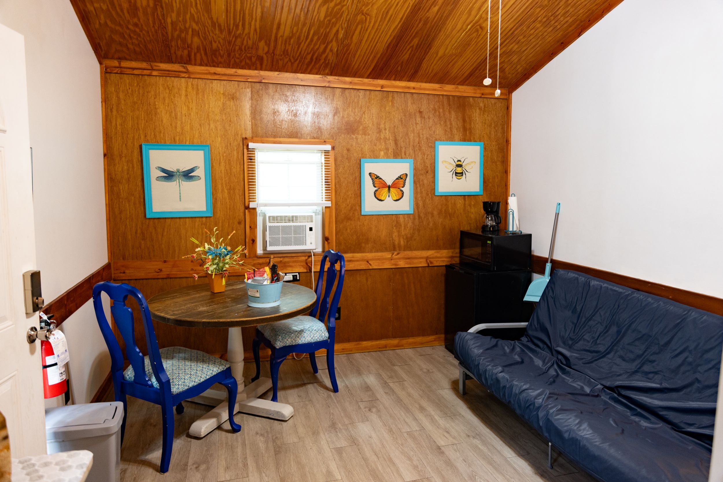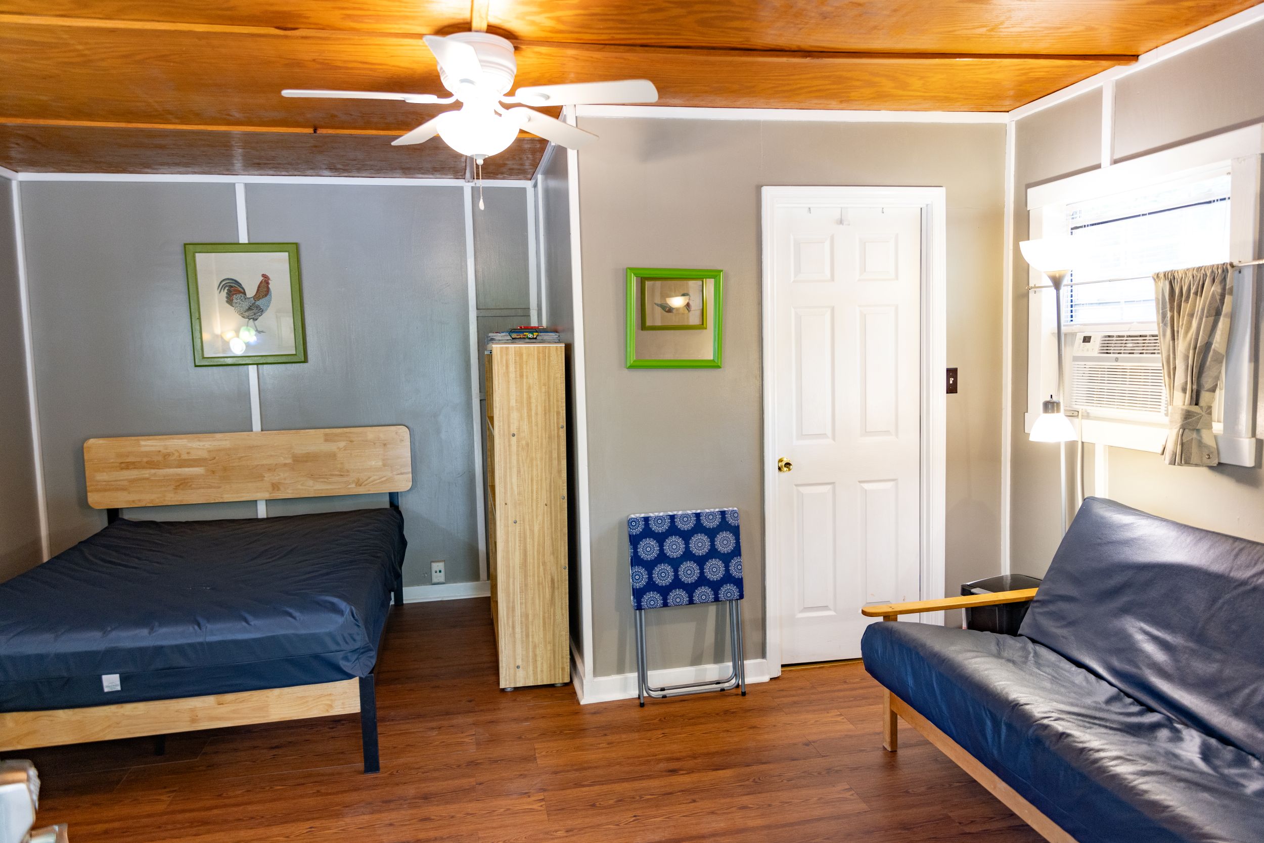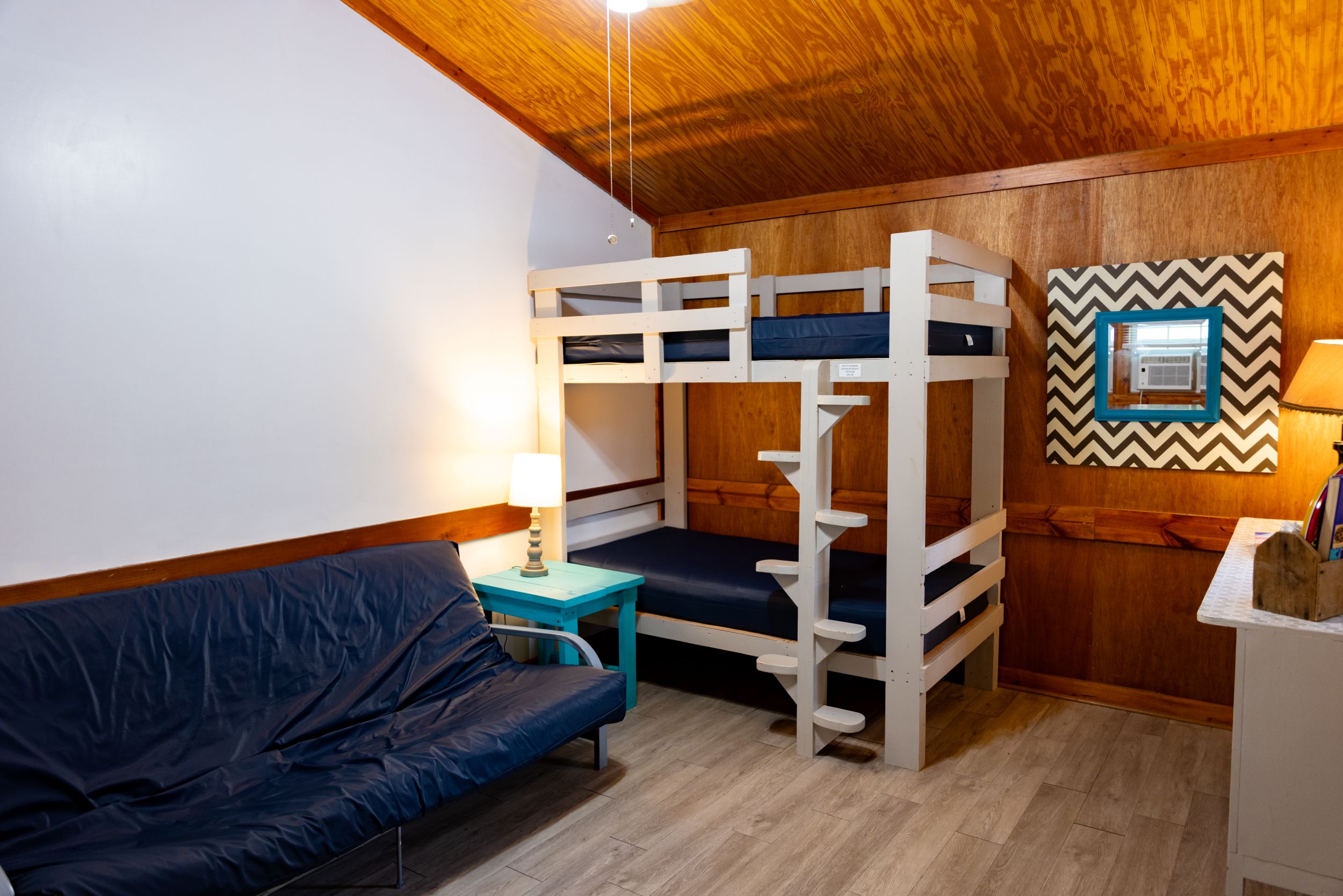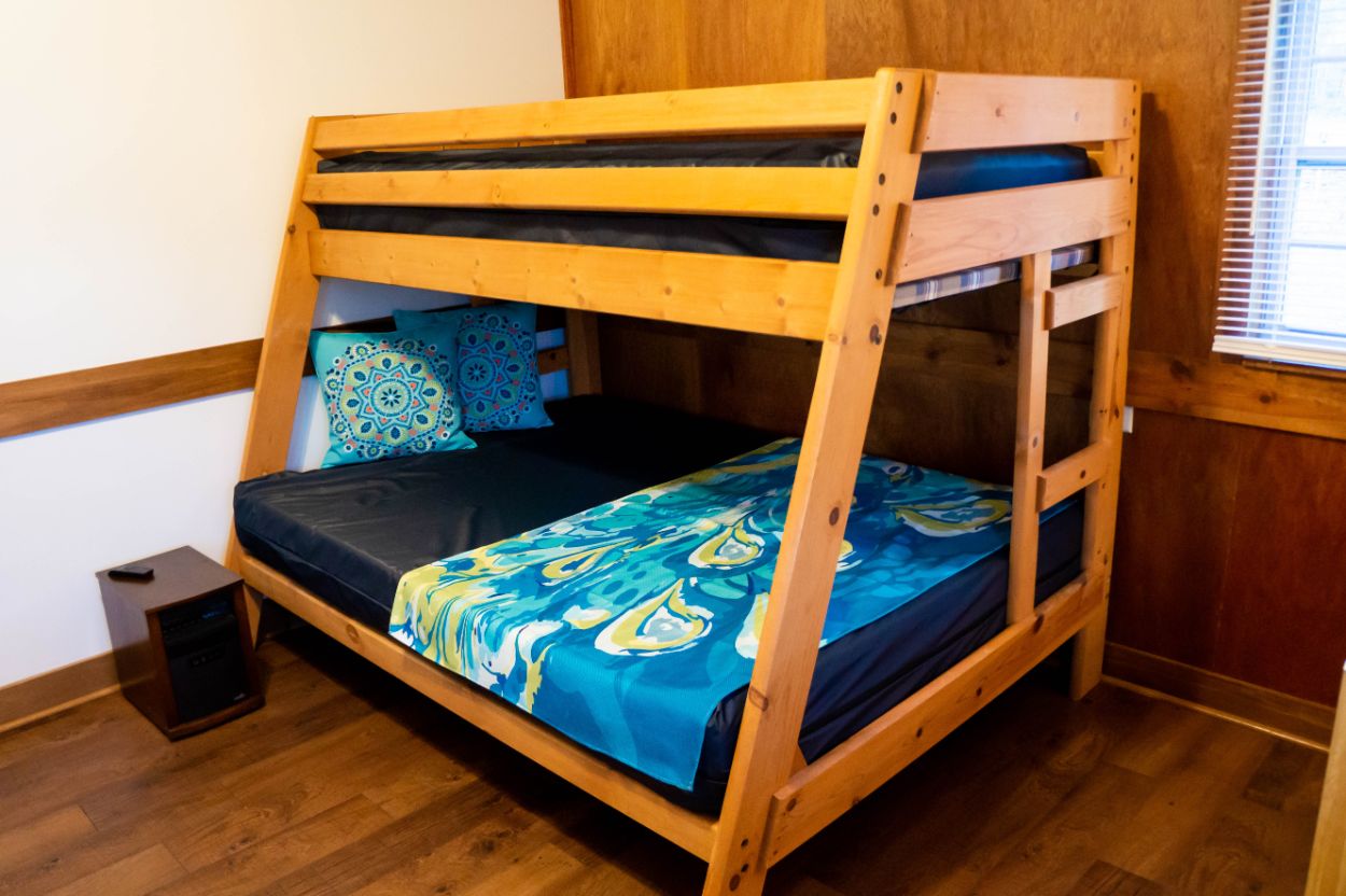 This is a rustic, one-room camping cabin; it has electricity, but no plumbing. Cabin 2 features Twin Bunk Beds – top bunk max weight 200lbs and a Full-size futon. There is a bathhouse and a coin-operated laundry room are near the cabin. The room has a microwave, small fridge, and a coffee pot. The cabin is fully furnished with beds, chairs, table, and other necessary furnishings, but our guests supply their own pillows, blankets, sheets, towels, pots, pans, plates, tableware. There is WiFi.