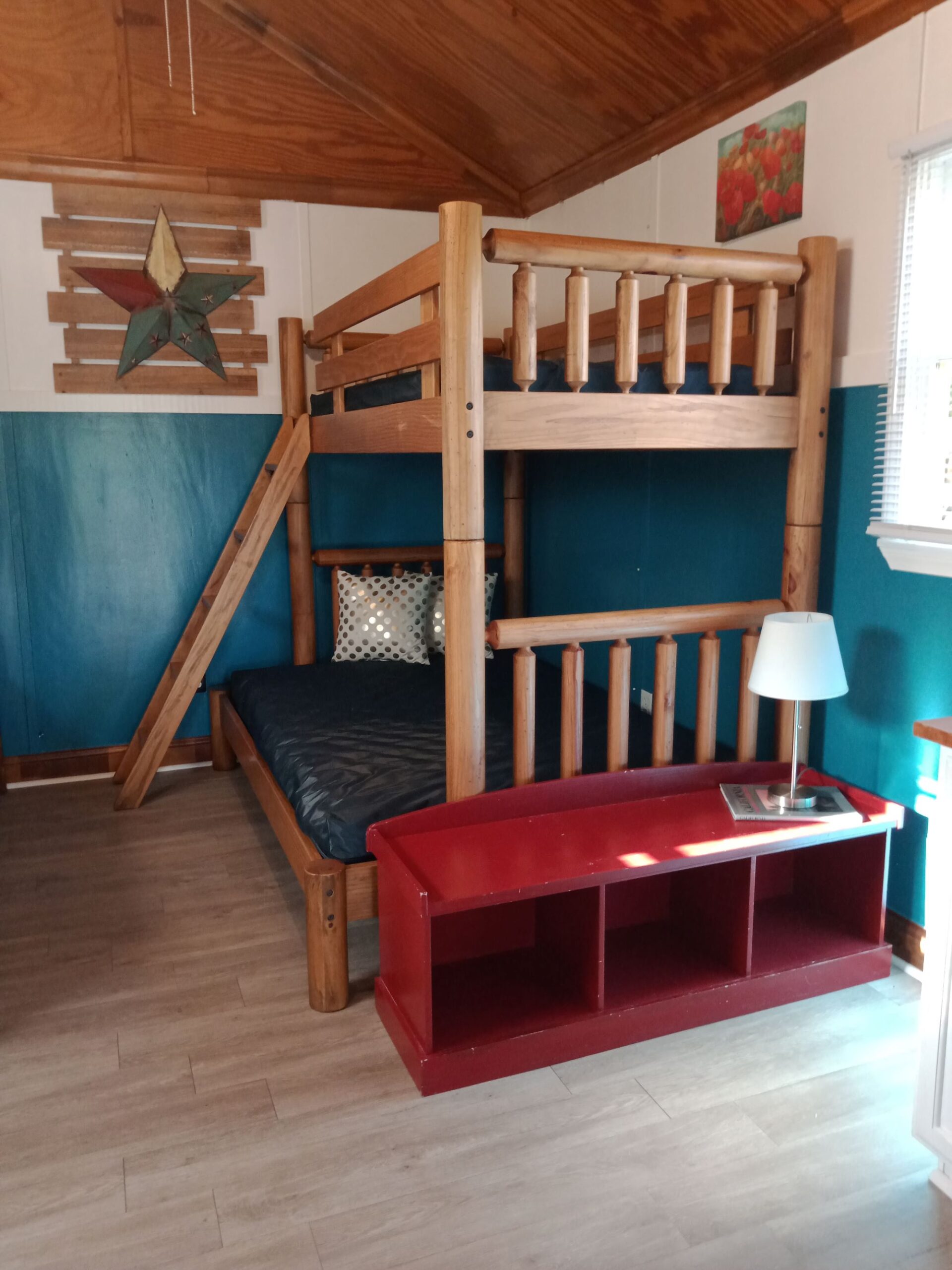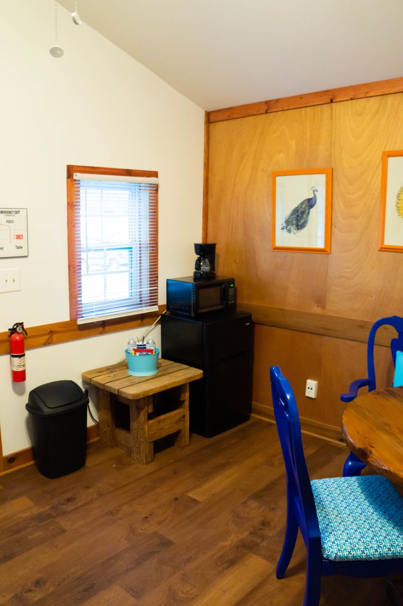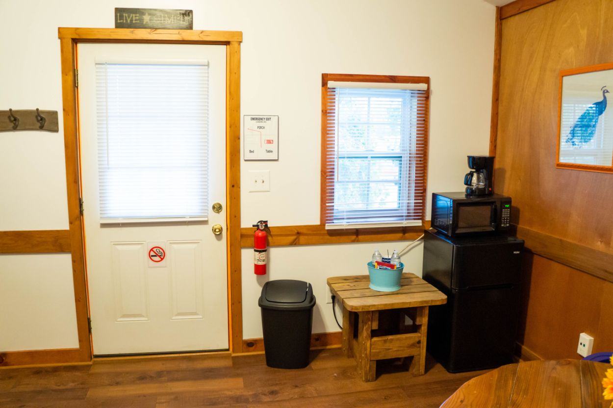 This is a rustic, one-room glamping cabin; it has electricity, but no plumbing. Cabin 3 features a Bunk Bed with full mattress on bottom and a twin on top – top bunk max weight 200lbs. There is a bathhouse and a coin-operated laundry room are near the cabin. The room has a microwave, small fridge, and a coffee pot. The cabin is fully furnished with beds, chairs, table, and other necessary furnishings, but our guests supply their own pillows, blankets, sheets, towels, pots, pans, plates, tableware. There is WiFi.