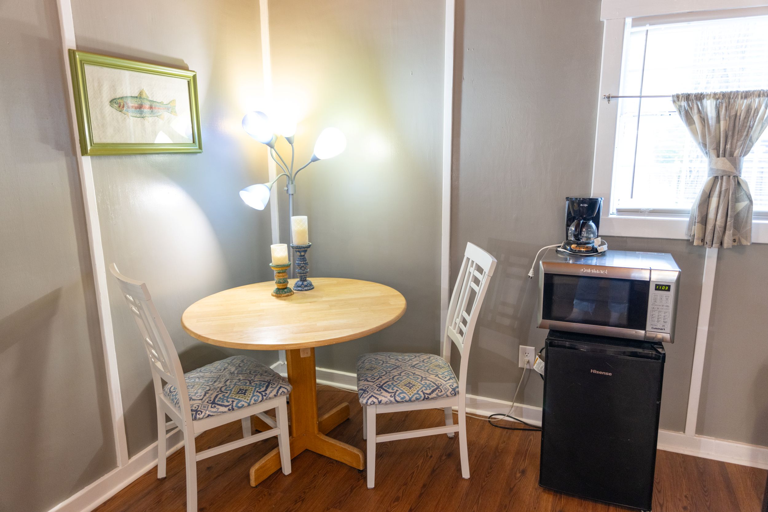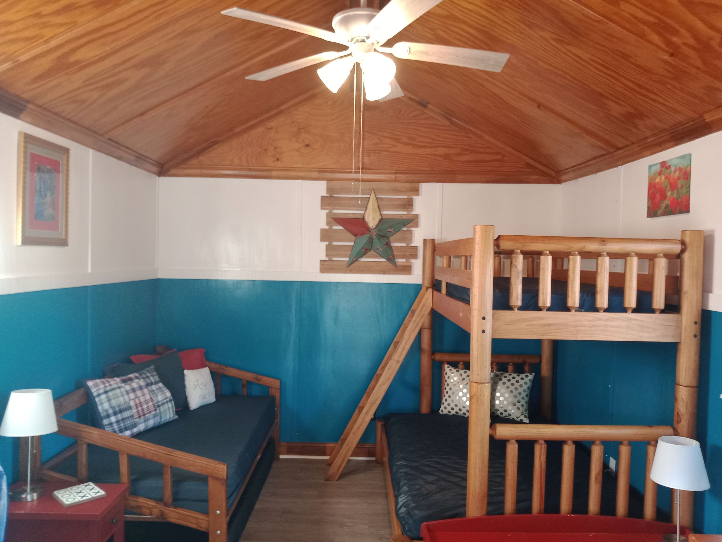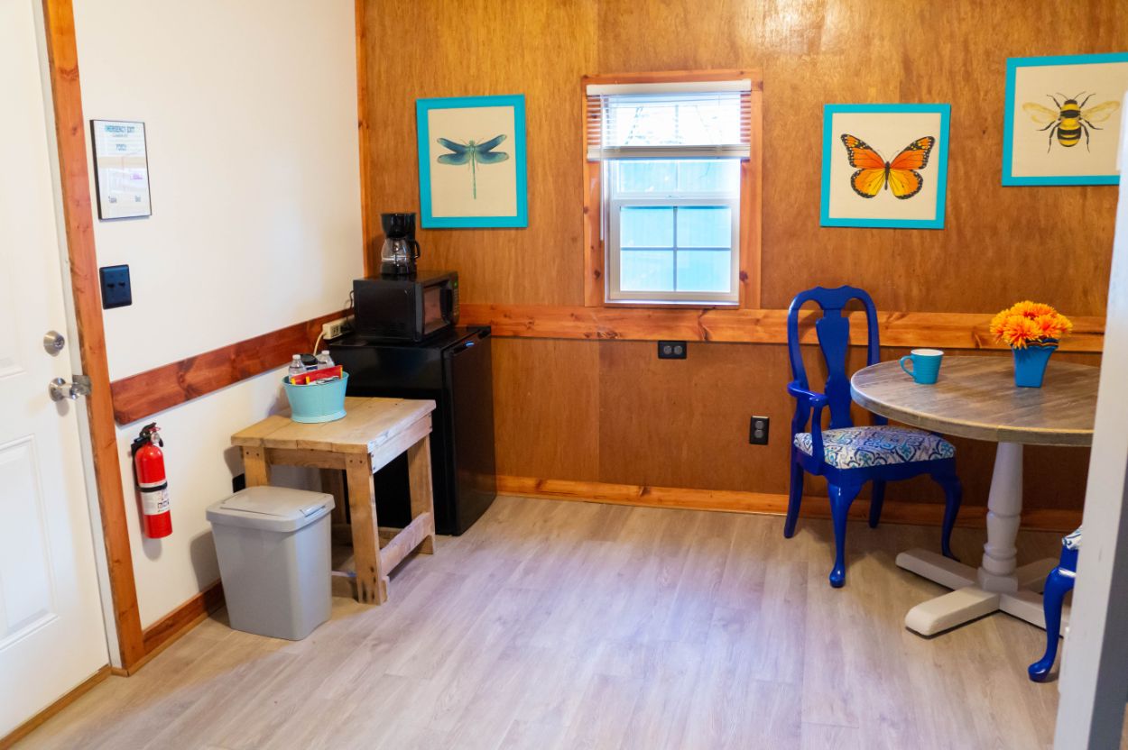 This is a rustic, one-room glamping cabin; it has electricity, but no plumbing. Cabin 3 features a Bunk Bed with full mattress on bottom and a twin on top – top bunk max weight 200lbs. There is a bathhouse and a coin-operated laundry room are near the cabin. The room has a microwave, small fridge, and a coffee pot. The cabin is fully furnished with beds, chairs, table, and other necessary furnishings, but our guests supply their own pillows, blankets, sheets, towels, pots, pans, plates, tableware. There is WiFi.