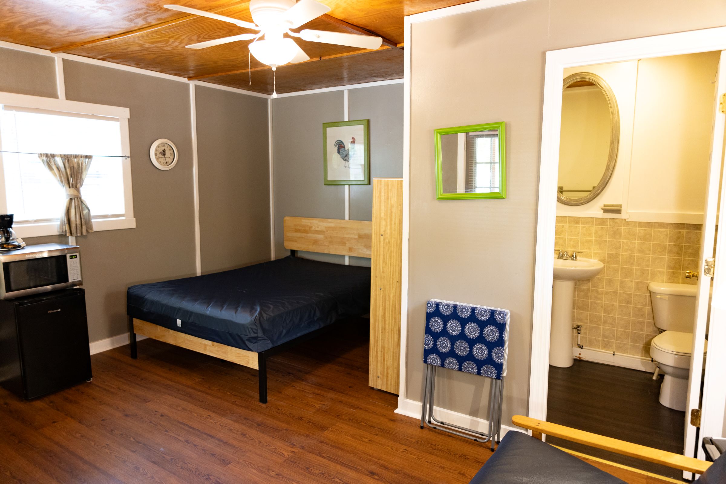 This cabin has electricity (heat and AC) and a half-bath (no shower, no hot water). There is a bathhouse and a coin-operated laundry room at the front office building. The room has a microwave, small fridge, and a coffee pot. This cabin offers a queen-sized bed. It is fully furnished with bed, chairs, table, and other necessary furnishings, but our guests supply their own pillows, blankets, sheets, towels, pots, pans, plates, tableware. There is WiFi.